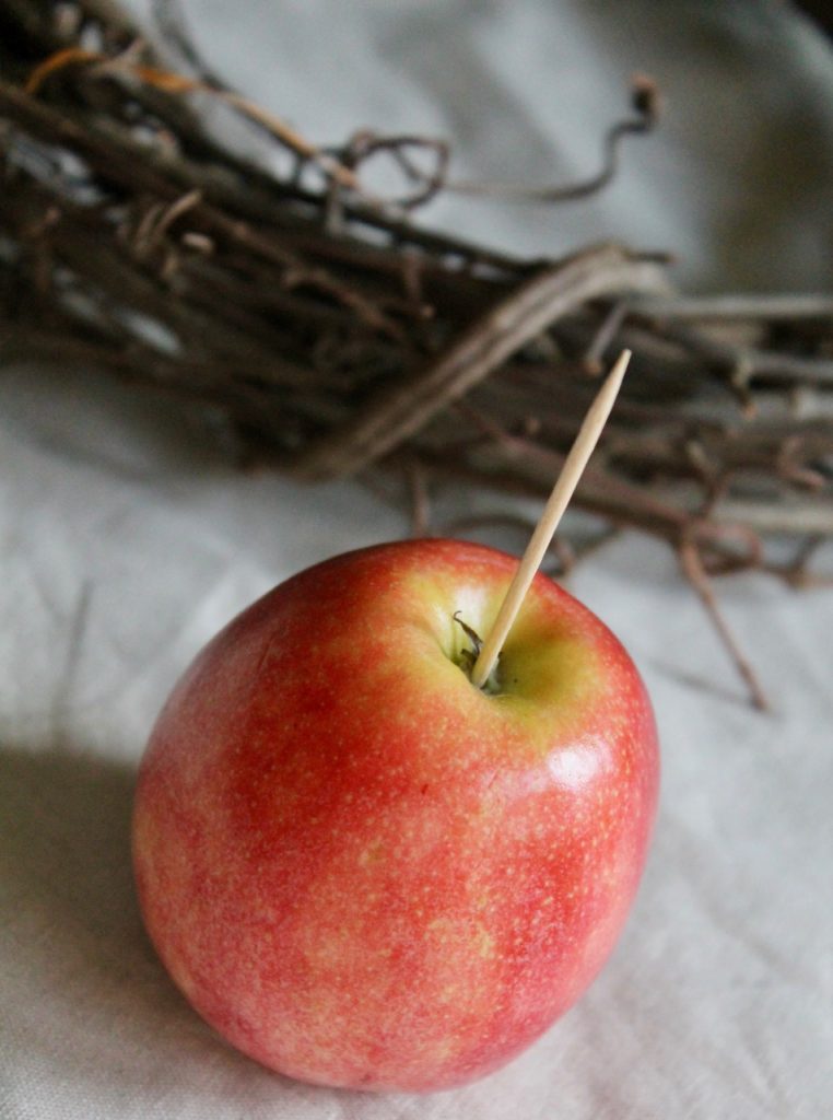 Stick the apple into the grapevine wreath. The toothpick should fit snuggly between the openings in the wreath. Make sure your placement is stable. You don’t want wobbly apples.