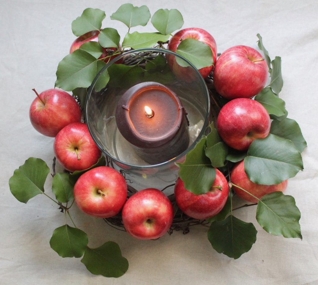 For this project you will need: a 12-inch grapevine wreath ($3.50 at craft stores), toothpicks, a bag of apples, green foliage (get a few clippings from your yard or buy some filler leaves at the supermarket), a candle and glass cylinder vase.