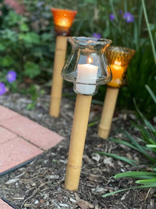 Thrift a few glass peg votives and grab some bamboo stakes and you’ve got yourself new lighting for your garden