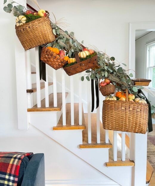 Search Salvation Army and Goodwill for baskets and decorate your stairway for Fall… To create this look, I used: an