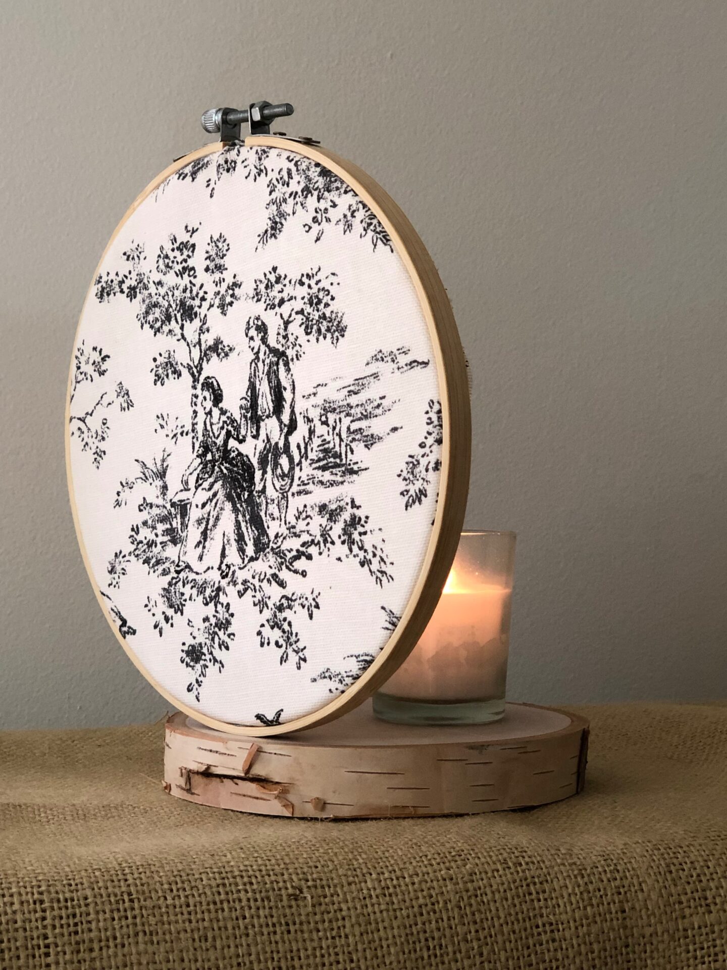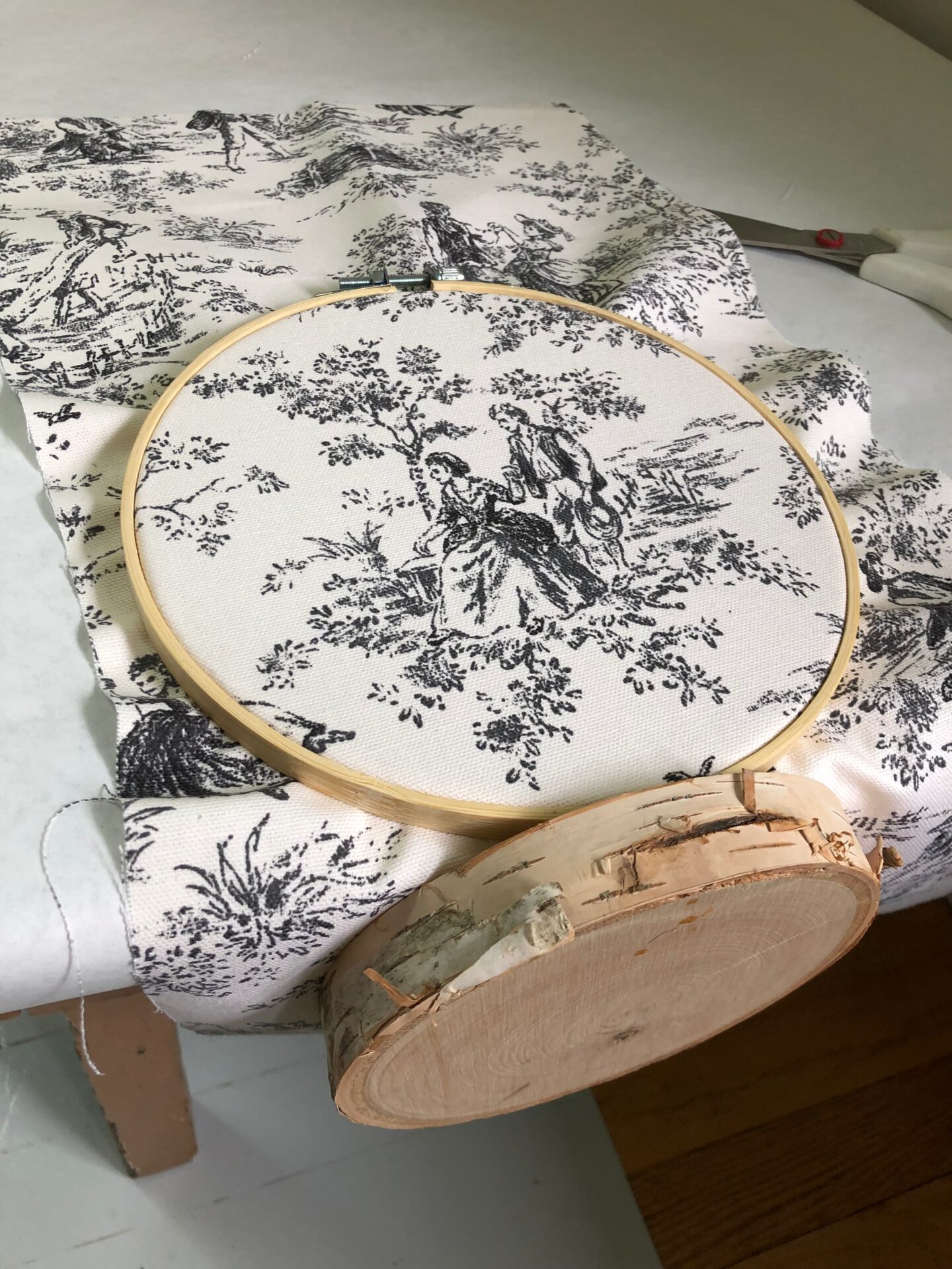 Place hoop onto edge of table to secure the fabric. Trim excess fabric.