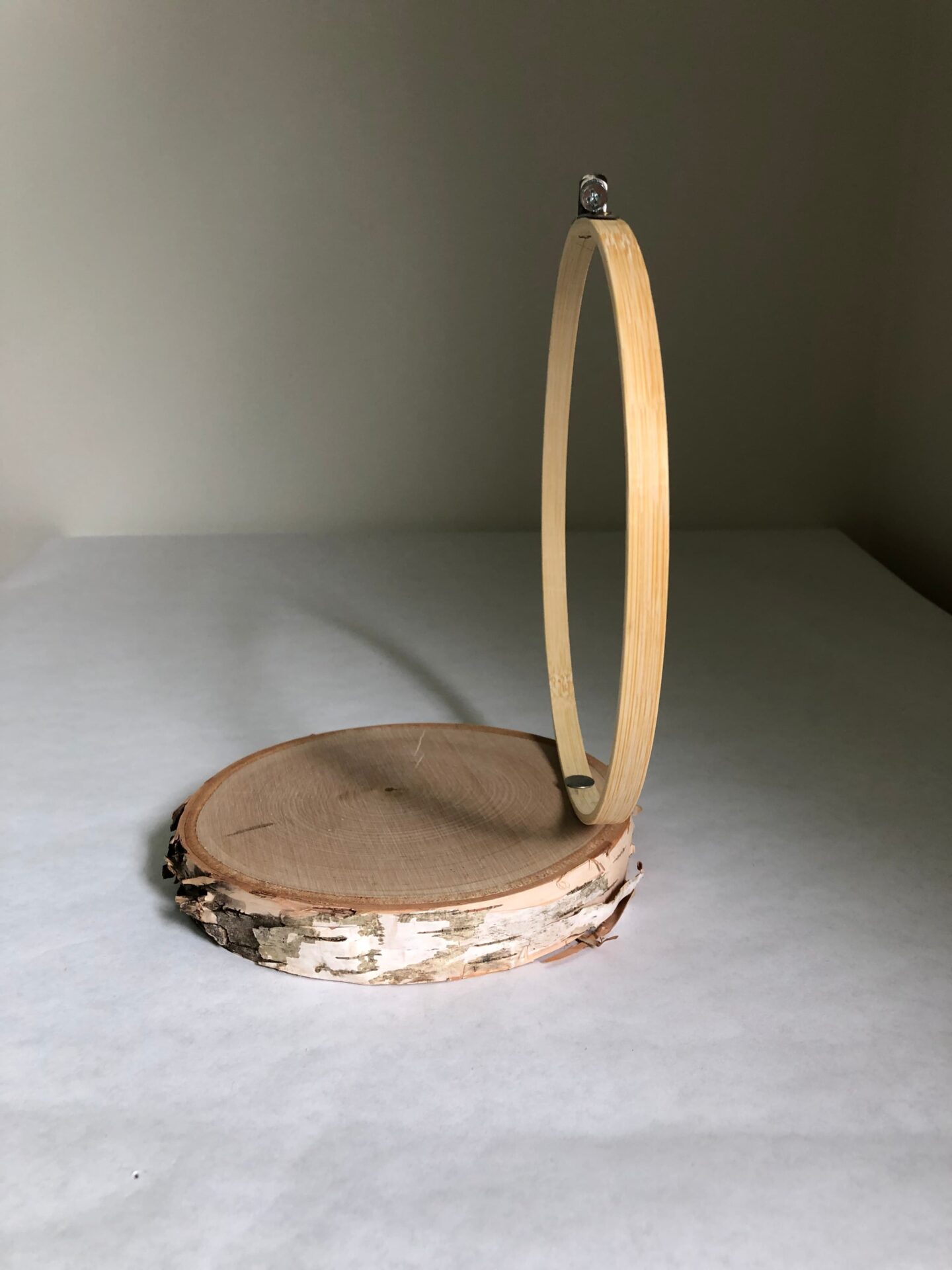 Drill a small hole into the outer embroidery hoop (on side opposite of closure). Attach the hoop to the base by driving a small nail or screw through the hole of your hoop and into base.