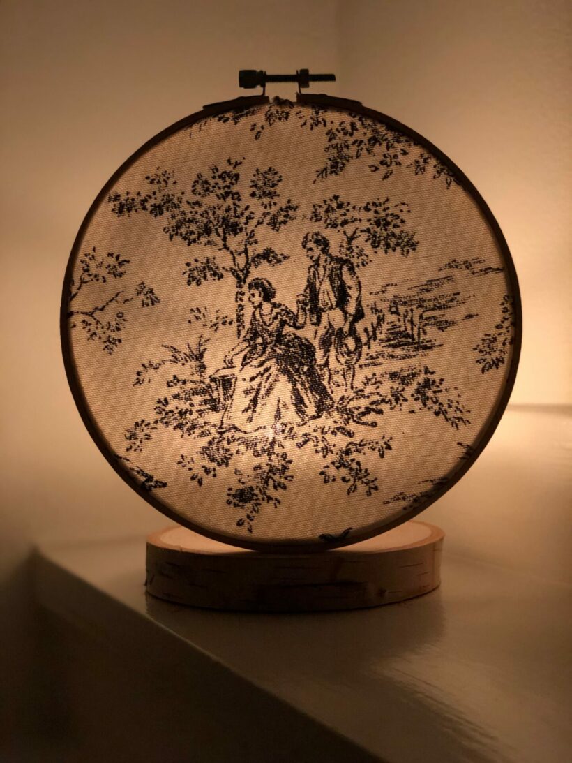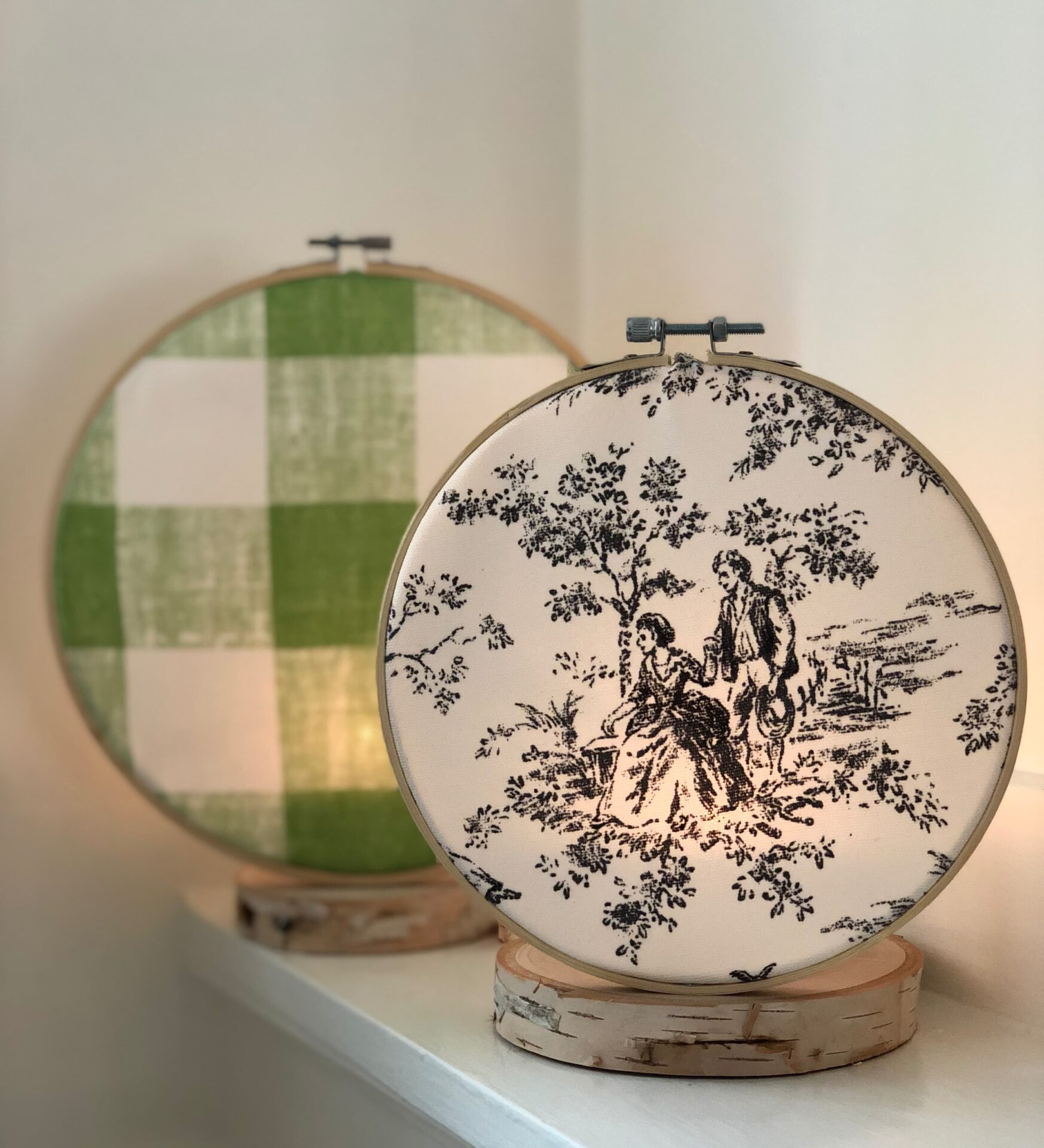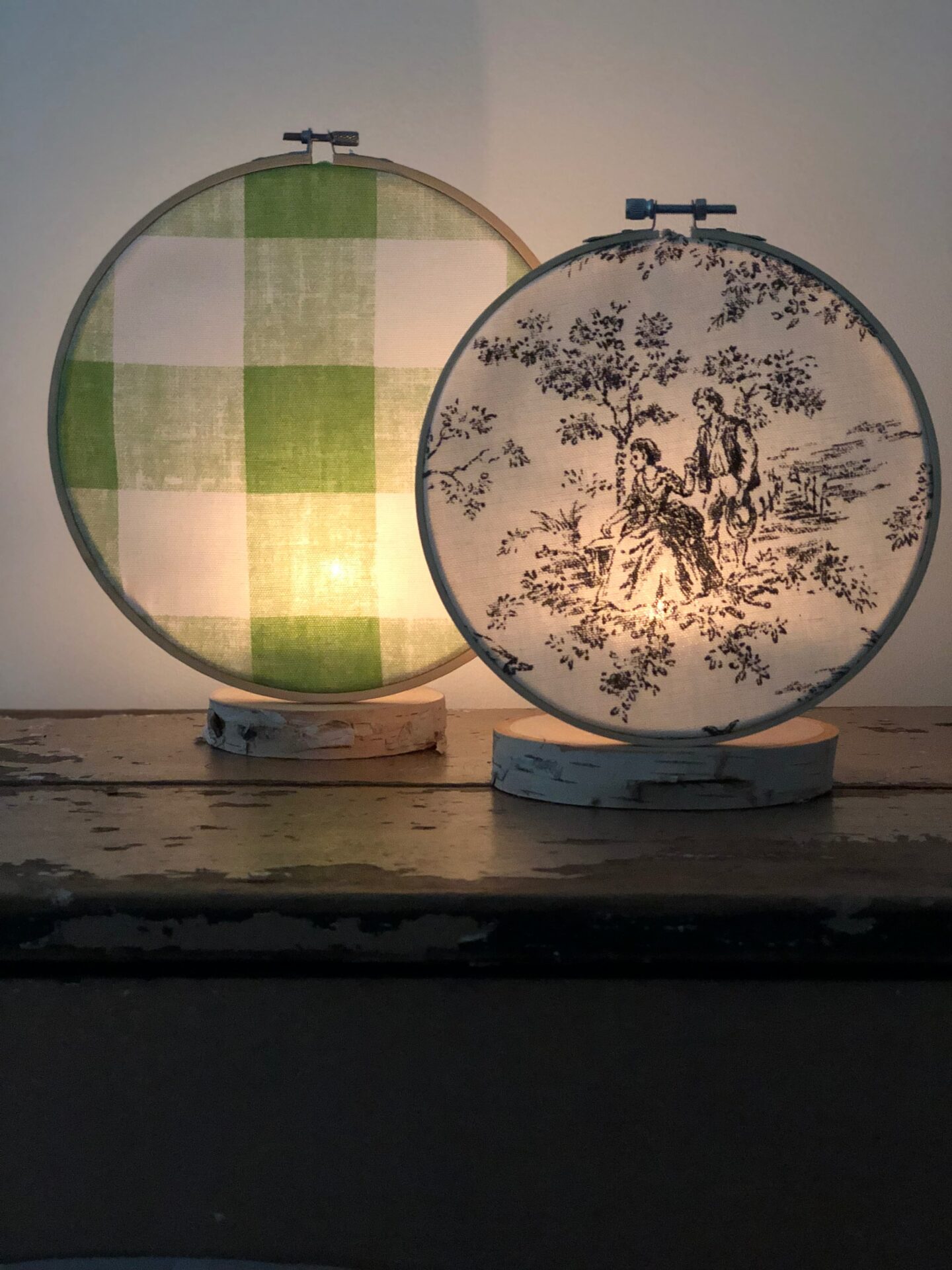 Create unique lighting with an embroidery hoop and some leftover fabric…