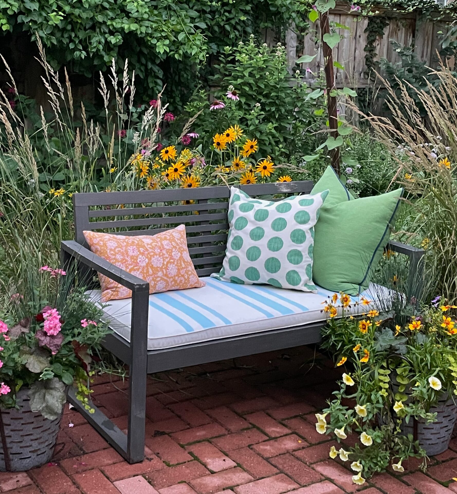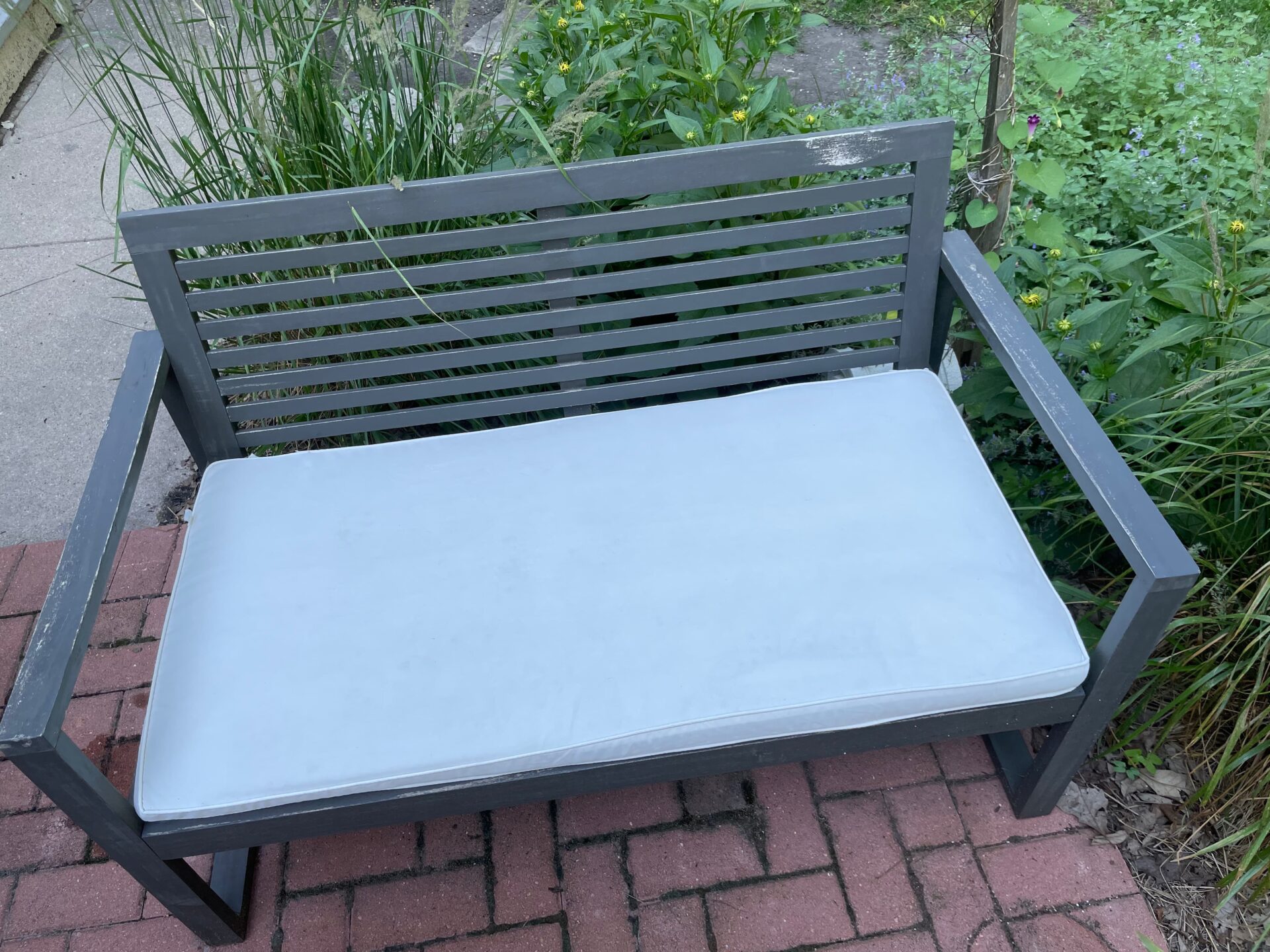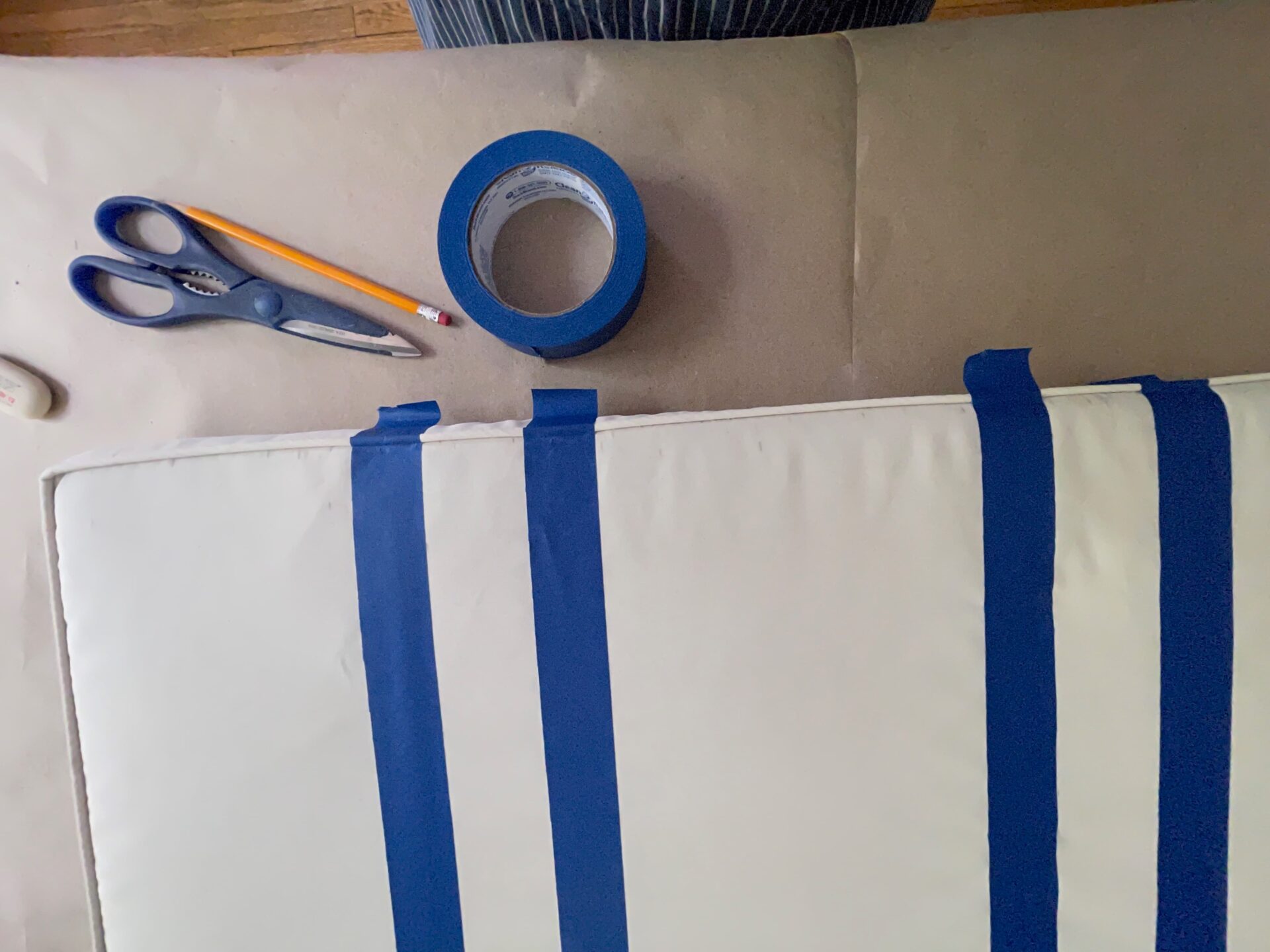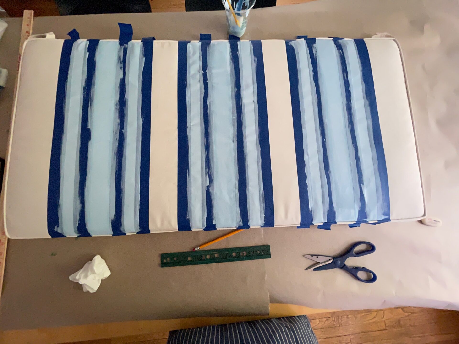 I wanted a striped cushion for our patio bench. Instead of buying a new one, I painted ours.