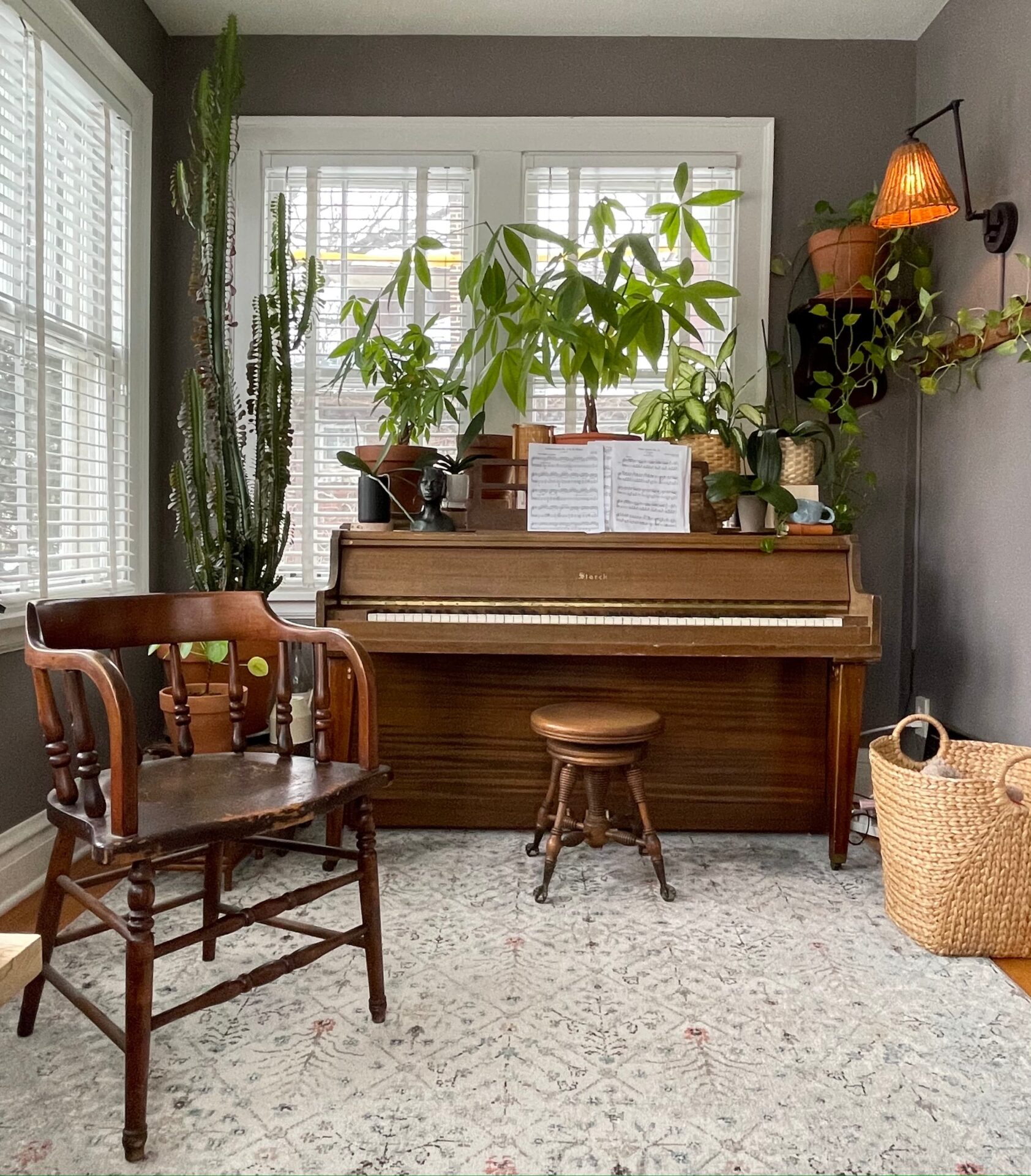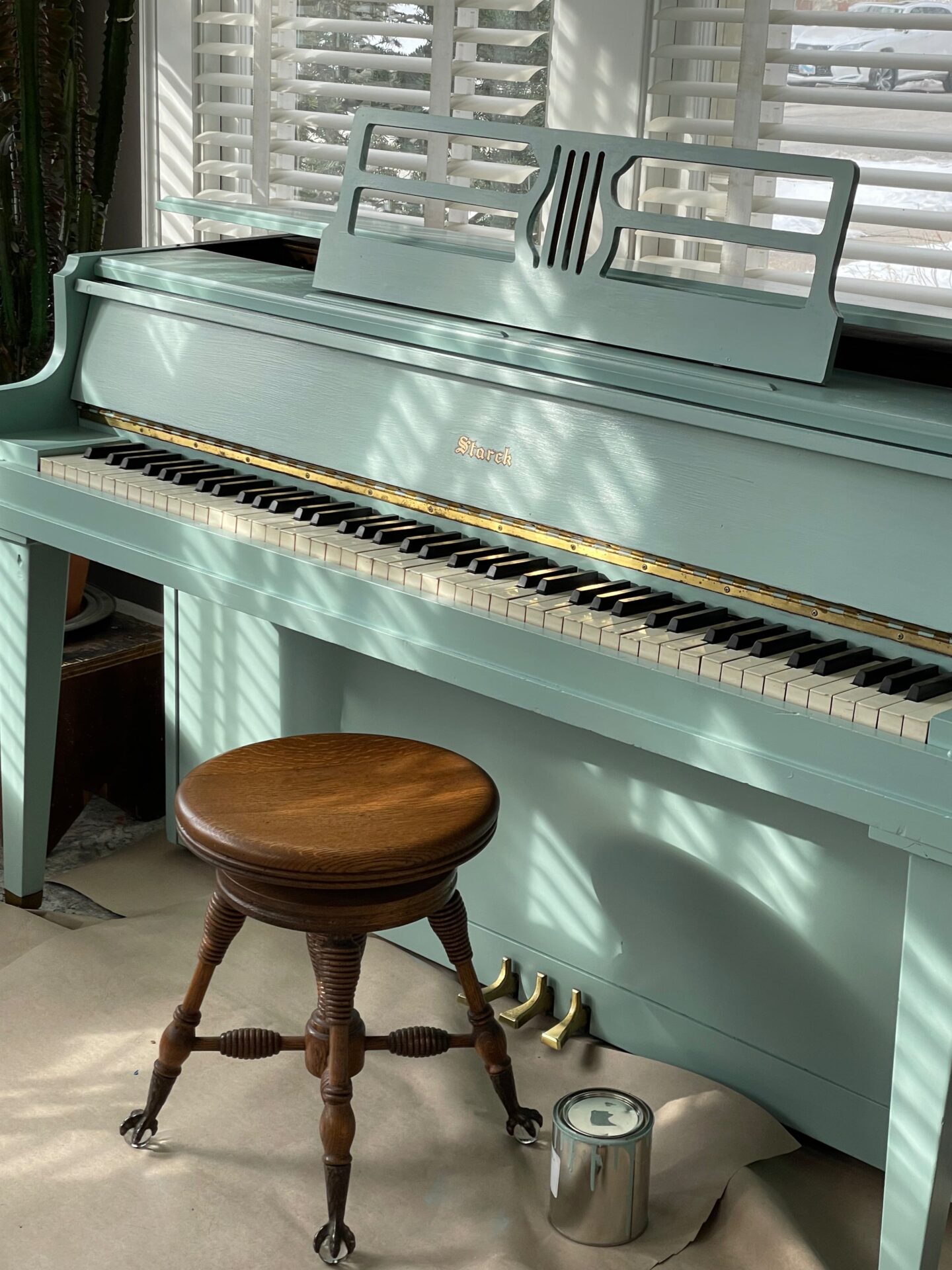 First I cleaned the piano surface, sanded lightly and wiped it down to remove sanding dust. I taped off brass details. Using a synthetic bristle brush, I applied a primer and then 4 coats of paint. To get into the delicate areas of the piano brand name, I used a small artist brush.