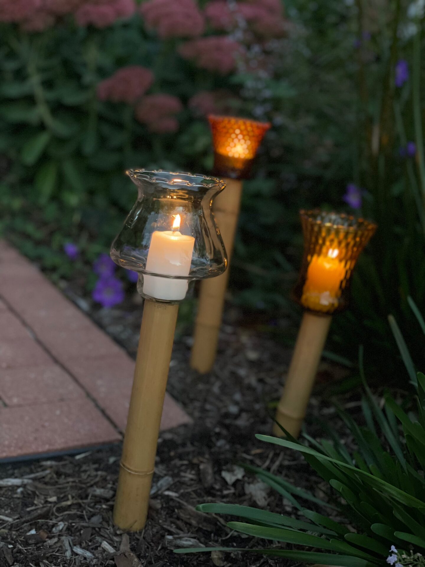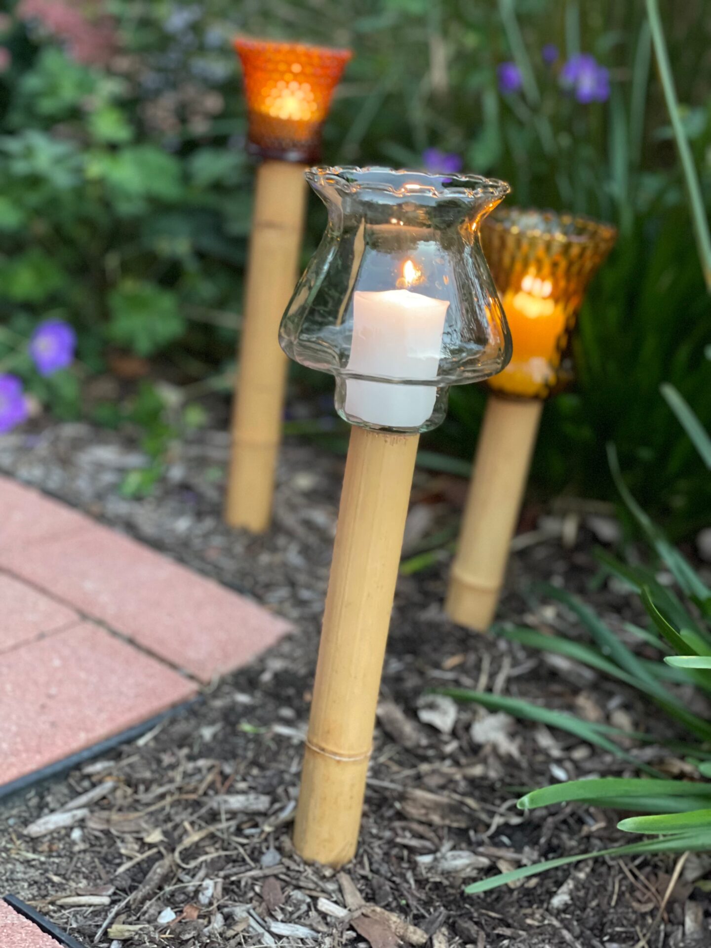 Thrift a few glass peg votives and grab some bamboo stakes and you’ve got yourself new lighting for your garden parties…