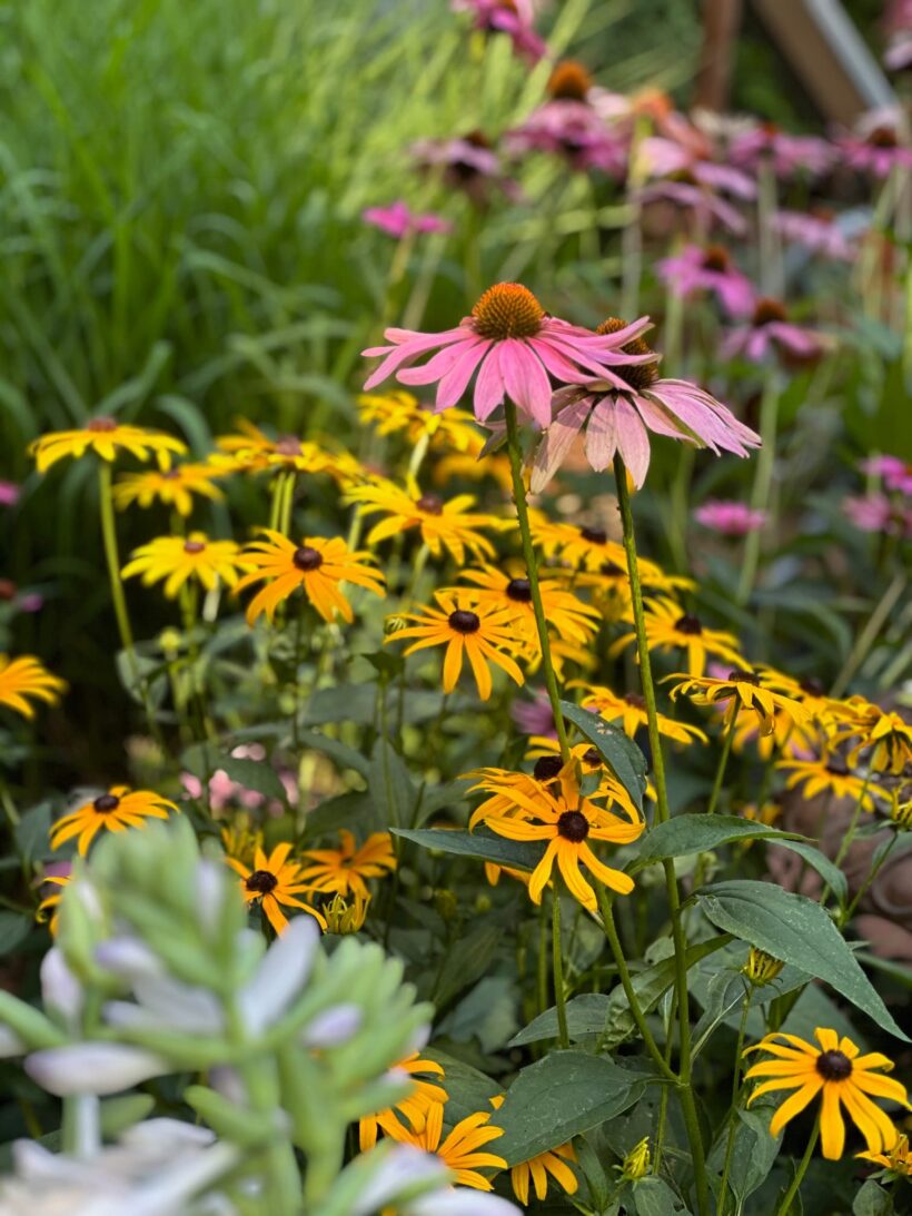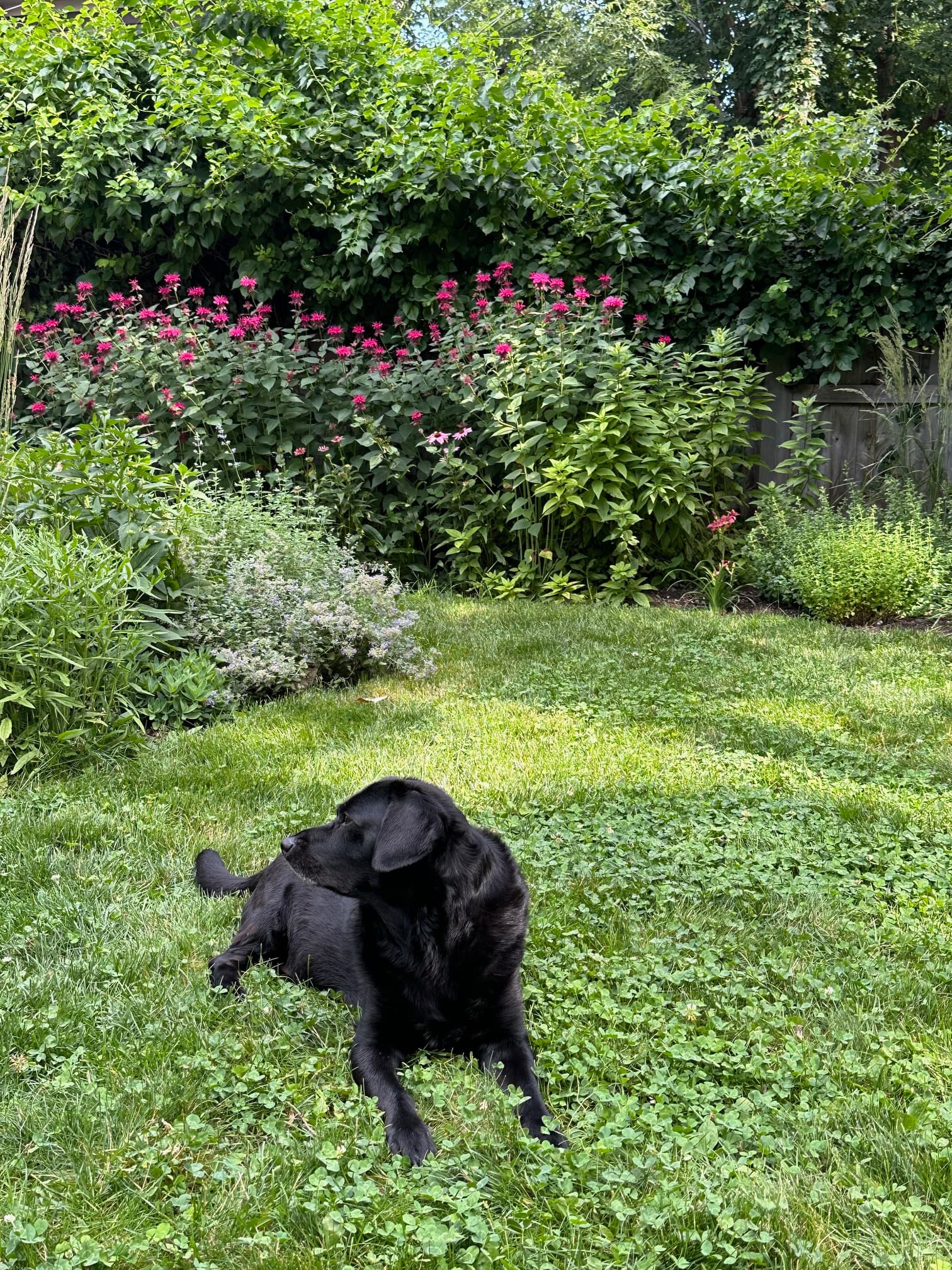 This is a photo taken from the same location in July. You really don’t need to clear out natural debris from the beds – the plants will push their way up through it. We also have a clover lawn with requires less watering and is impervious to dog urine.