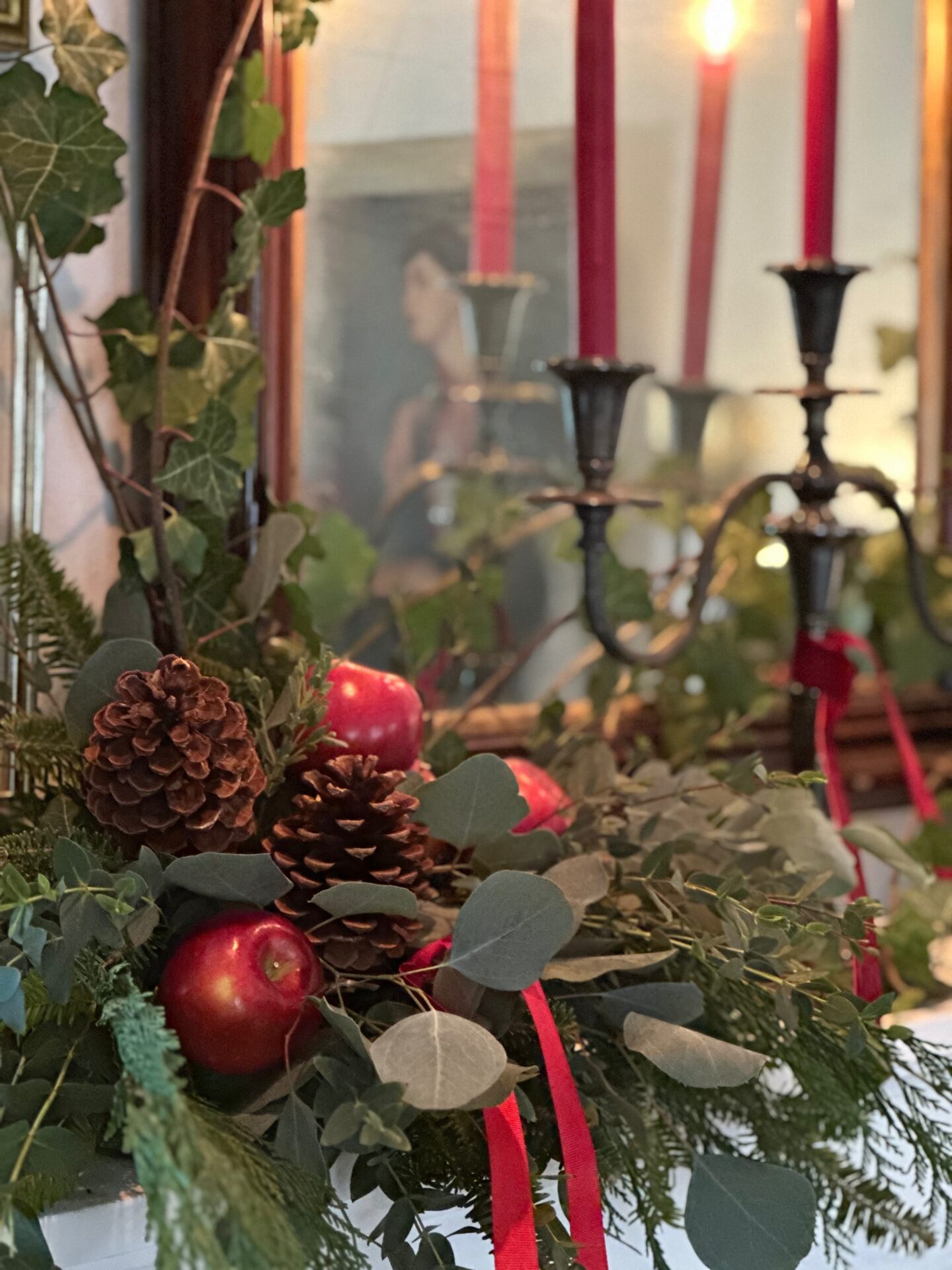 I found a beautiful candelabra at our local Goodwill for only $6.00 – it’s a good piece, very heavy. I knew it needed to be the center of attention on our holiday mantel so I built a floral design around it…