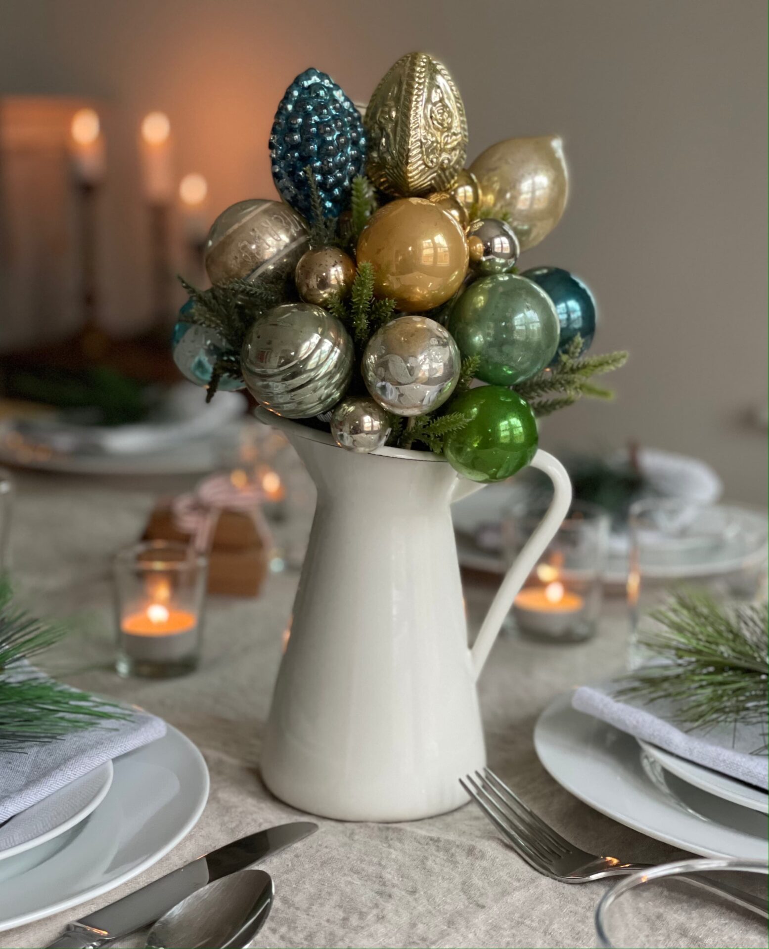 What’s nice about this project is that no glue is needed – you can disassemble the arrangement – the ornaments aren’t damaged. Just reconnect the caps and pack them away for next year.