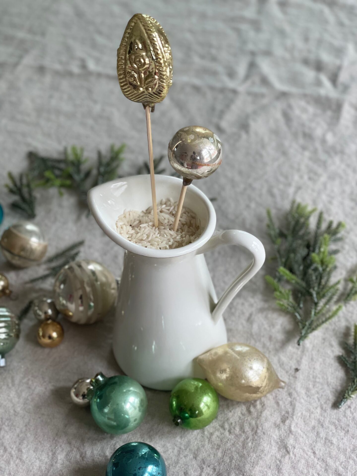 Fill a vessel with uncooked rice, stick in some 12″ bamboo skewers (you can cut some skewers down to help with the overall shape and placement of ornaments and create variation in height). Gently remove the metal caps from ornaments (and save them in a bag so you can reattach them later), place the ornaments onto the bamboo tips. Fill in any open spots with moss or small greenery clippings.