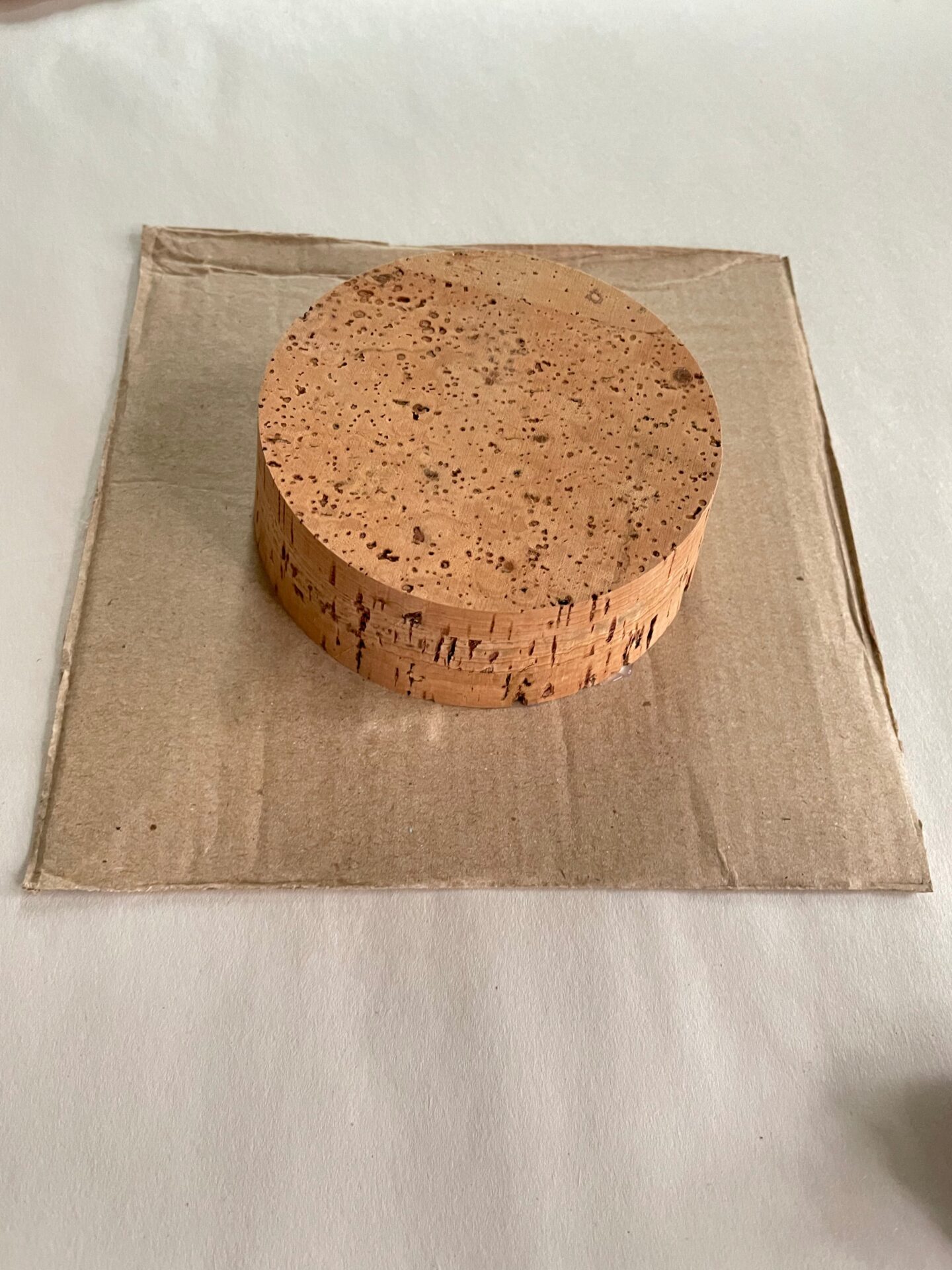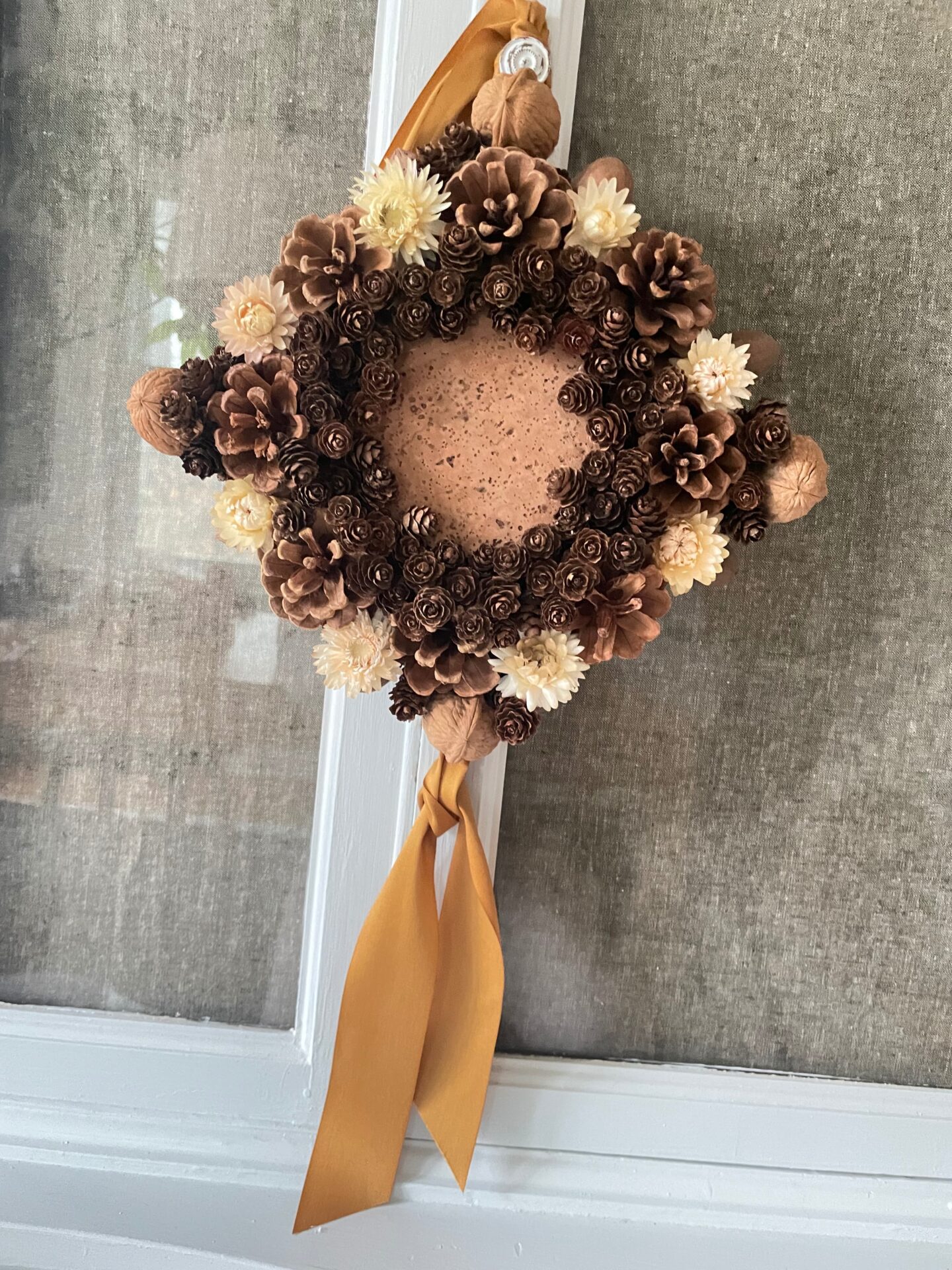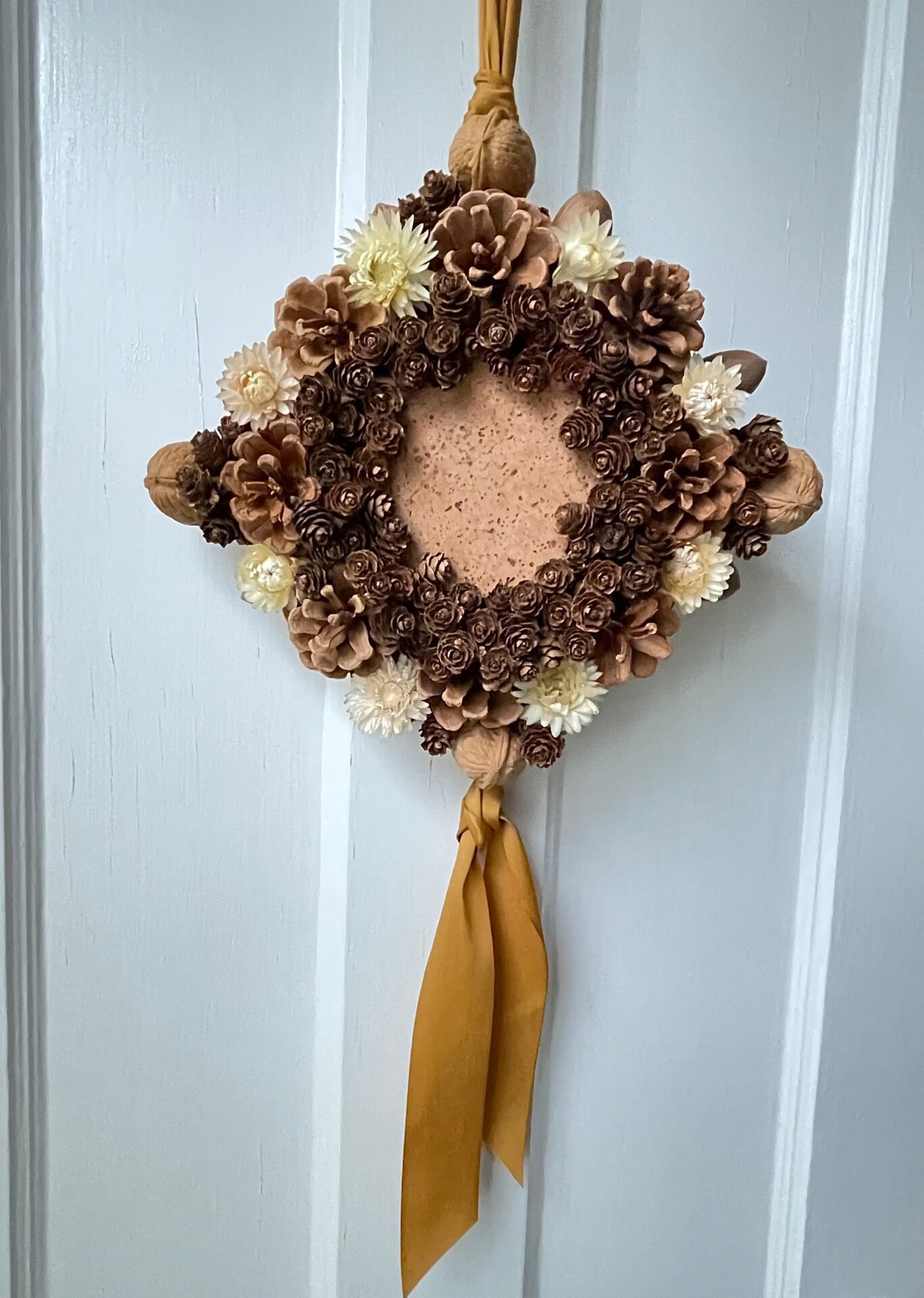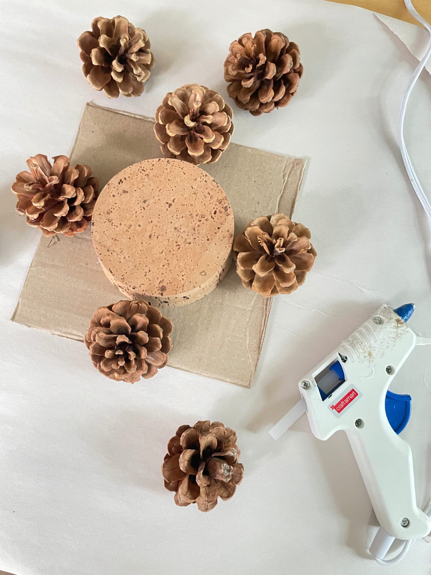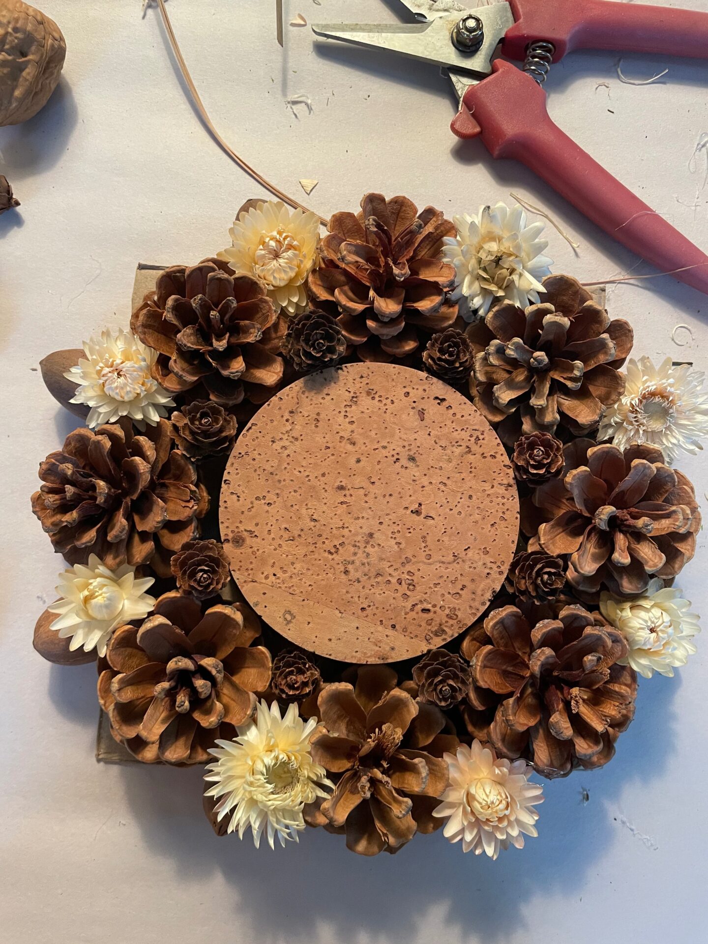 For this project you will need: a 3″ diameter cork (purchased online), dried flowers, pine cones, nuts, a square piece of cardboard, ribbon and hot-glue gun.